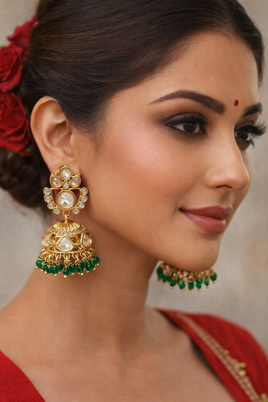 MOISSANITE FLORAL JHUMKIS WITH EMERALD GREEN BEADS