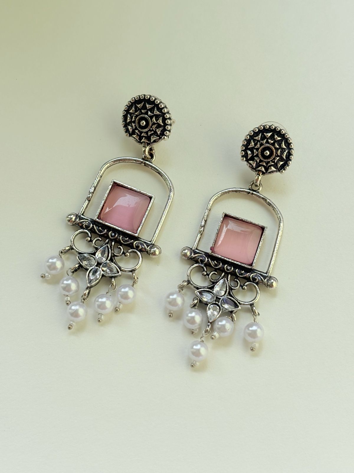 Add a touch of vintage charm to your jewelry collection with these beautifully crafted statement earrings. Designed with intricate oxidized detailing, these earrings feature a stunning square-cut mustard yellow stone set within a delicate arch frame, creating a unique and elegant look. The ornate floral motif and shimmering stones below add a hint of sparkle, while the dangling pearl drops bring graceful movement and timeless sophistication.